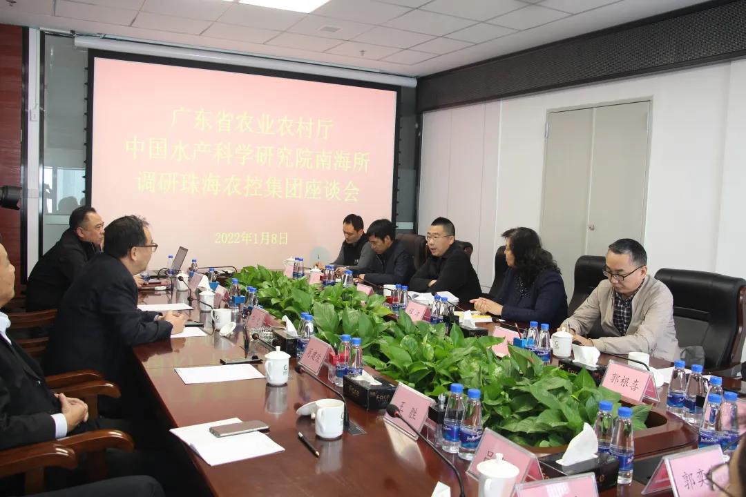 2022年1月8日,中國(guó)水產(chǎn)科學(xué)研究院南海所黨委書記程潔、廣東省農(nóng)業(yè)農(nóng)村廳漁業(yè)發(fā)展處副處長(zhǎng)劉鄧軍帶領(lǐng)漁業(yè)領(lǐng)域?qū)<壹夹g(shù)團(tuán)隊(duì)到珠海農(nóng)控集團(tuán)調(diào)研座談。珠海農(nóng)控集團(tuán)黨委書記、董事長(zhǎng)張凡,副總經(jīng)理肖建波、珠海市農(nóng)業(yè)農(nóng)村局、鶴洲新區(qū)籌備組相關(guān)負(fù)責(zé)同志出席會(huì)議。