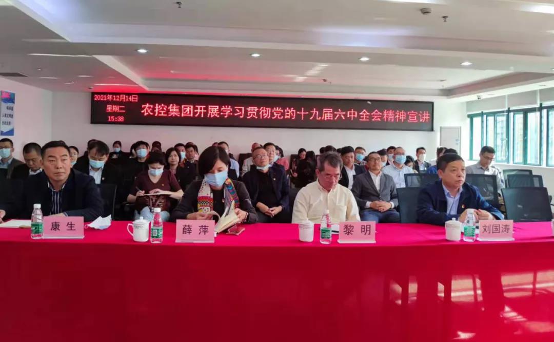 為深入學(xué)習(xí)貫徹黨的十九屆六中全會(huì)精神,深入領(lǐng)會(huì)全會(huì)精神內(nèi)涵,2021年12月14日下午,農(nóng)控集團(tuán)黨委邀請(qǐng)市委宣講團(tuán)成員曾本偉同志進(jìn)行了學(xué)習(xí)貫徹黨的十九屆六中全會(huì)精神宣講。市委黨史學(xué)習(xí)教育第十四巡回指導(dǎo)組、集團(tuán)領(lǐng)導(dǎo)班子成員、各二級(jí)企業(yè)班子成員、各基層黨支部書(shū)記、黨務(wù)工作者、黨員代表等80余人參加會(huì)議。會(huì)議由集團(tuán)黨委副書(shū)記劉國(guó)濤同志主持。
